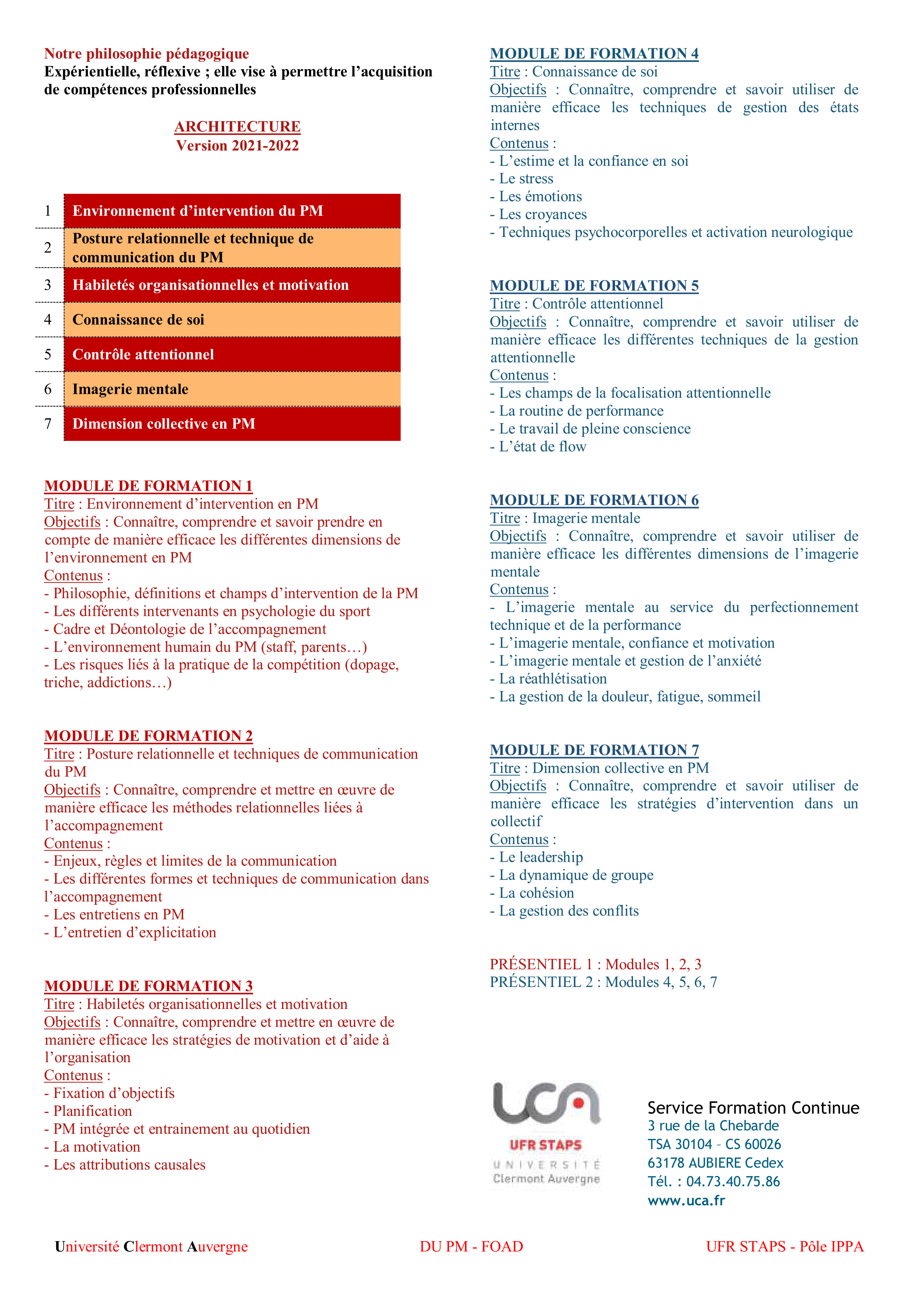 La formation permet l'acquisition de connaissances et compétences dans le domaine de la préparation mentale (PM) des sportifs articulées autour de 7 thématiques :