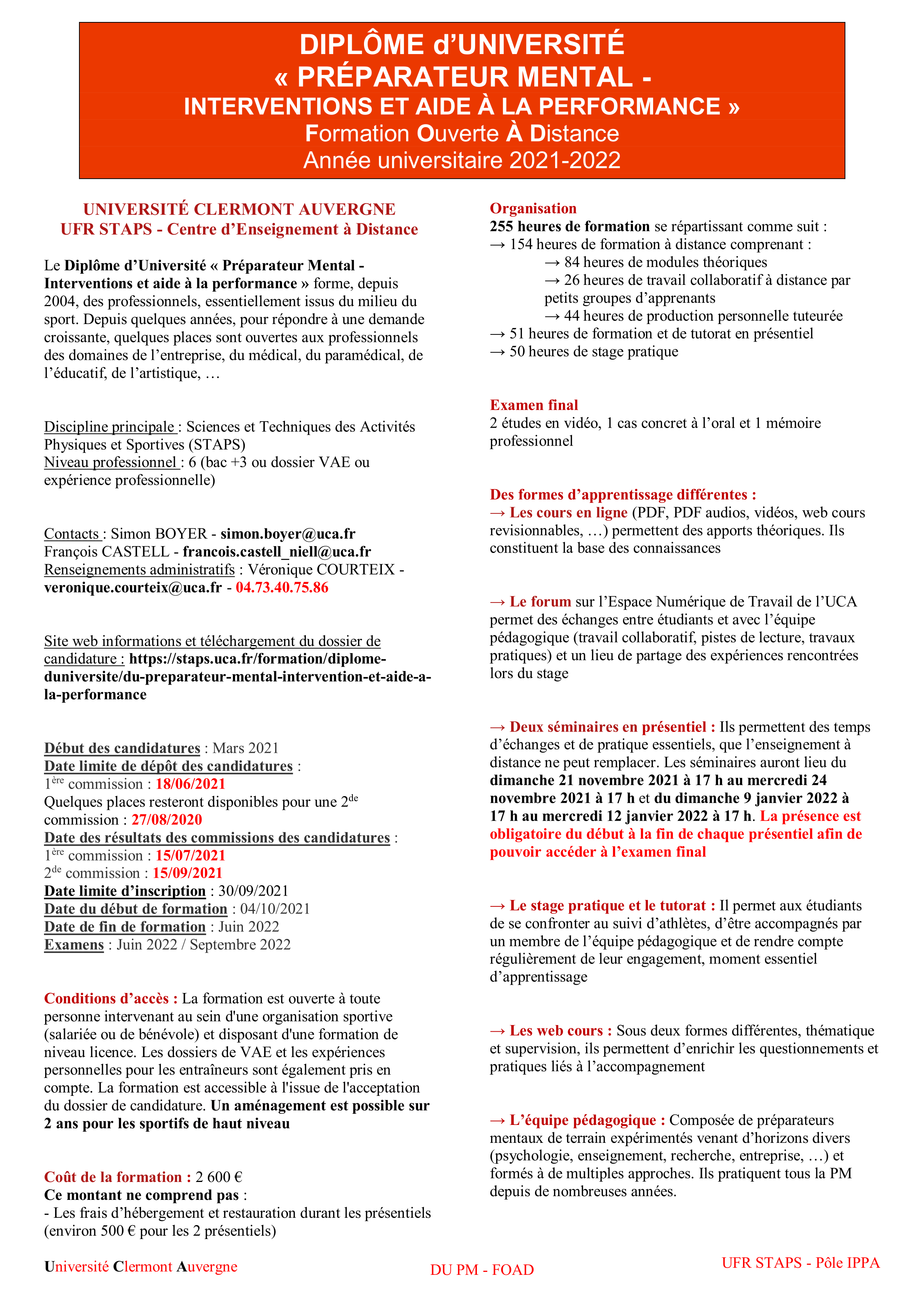 * 50 h de stage pratique.Le stage permet aux étudiants de se confronter au suivi d'athlètes, d'être accompagnés par un membre de l'équipe pédagogique et de rendre compte régulièrement de leur engagement, moment essentiel d'apprentissage. - Langues d'enseignement