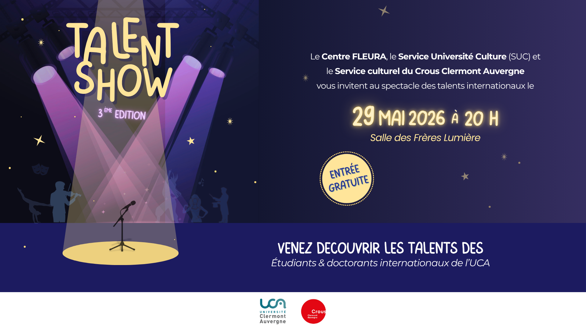 Après un appel à participation réussi, venez soutenir les talents sélectionnés pour le Talent Show, ce 29 mai 2026 à partir de 20h00.
