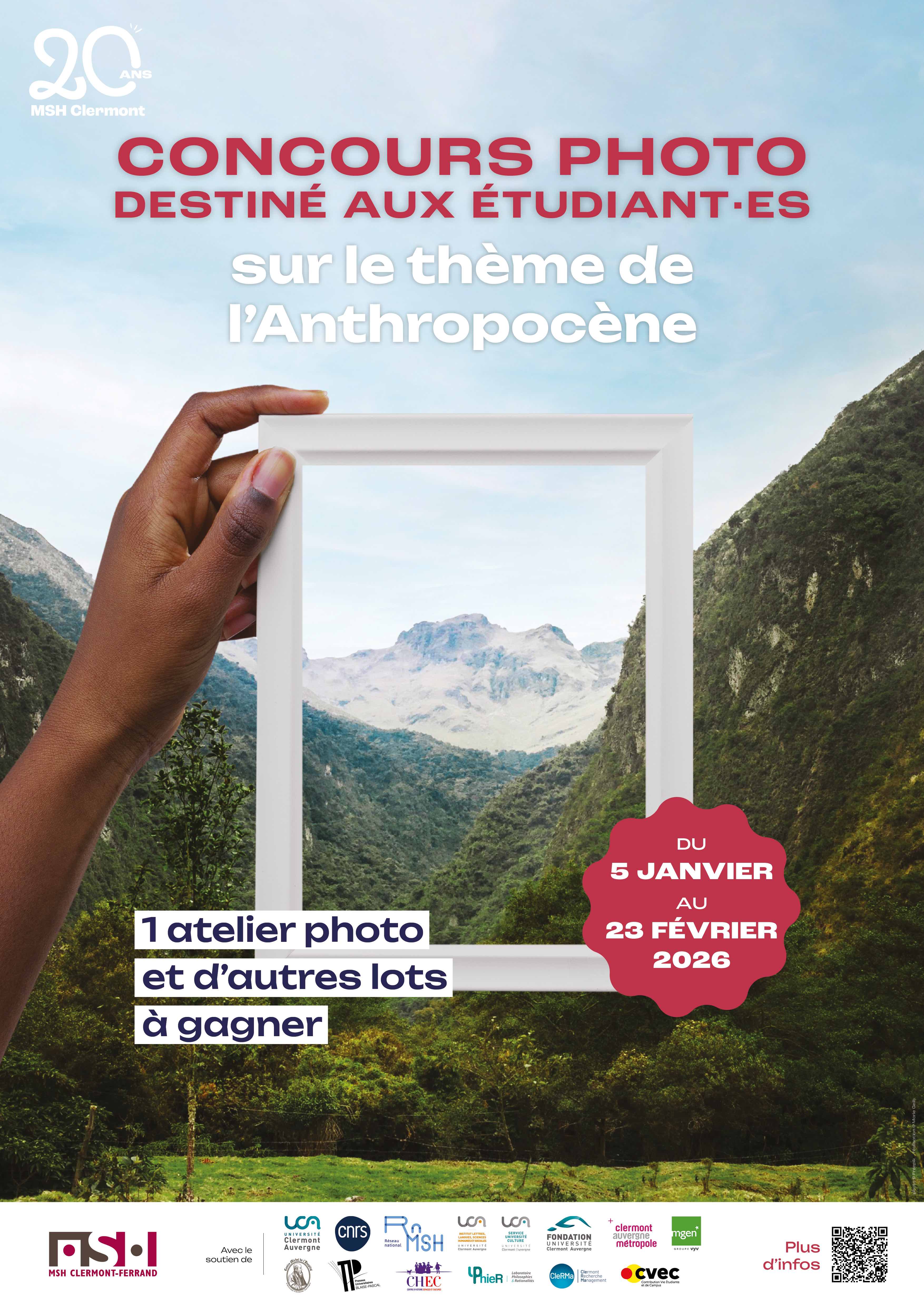 À l’occasion de ses 20 ans, la Maison des Sciences Humaines de Clermont-Ferrand organise, du 5 janvier au 23 février 2026, un grand concours photo ouvert à l’ensemble des étudiant·es de l’UCA, sur le thème de l’Anthropocène. Le jury sélectionnera 30 photographies qui feront l’objet d’une exposition à la MSH et trois lauréat·es seront récompensé·es (lots à gagner). Ouvrez l’œil et exprimez, à travers la photo, votre vision de l’empreinte humaine sur le monde !