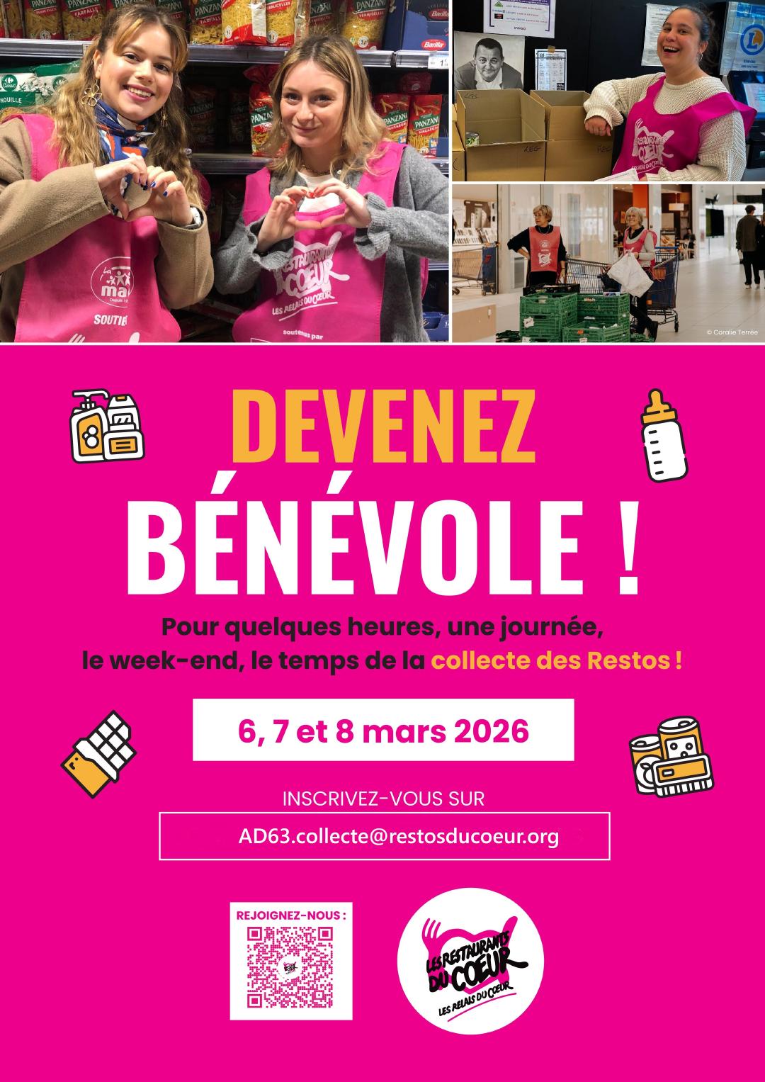 Les 6, 7 et 8 mars 2026, les Restos du Cœur organisent leur grande collecte nationale sur l’agglomération clermontoise. Devenez bénévole le temps d’une journée ou d’une demi-journée : chaque participation compte.