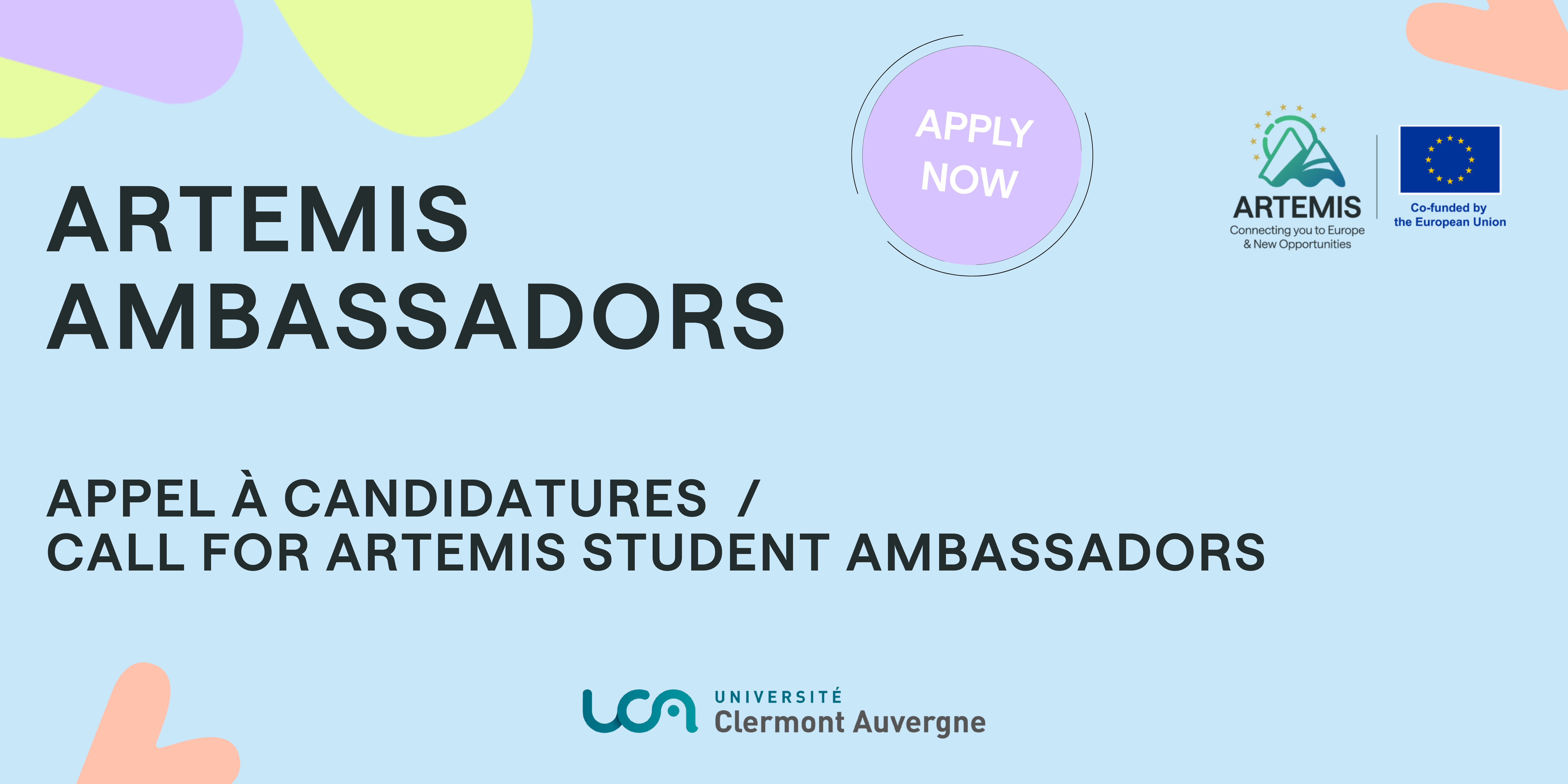 ARTEMIS est l'alliance d'Universités Européennes coordonnée par l'Université Clermont Auvergne. Pour le second semestre 2025/2026, nous lançons un appel à candidatures pour recruter de nouveaux étudiants ambassadeurs. Nous recherchons des profils motivés et curieux, prêts à contribuer à la visibilité et à la promotion de l’alliance !